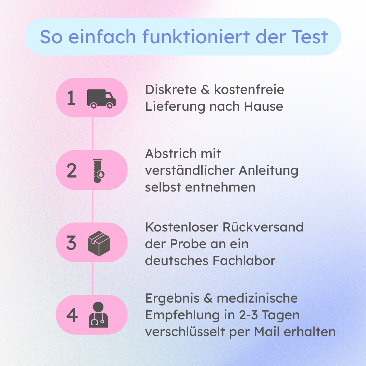 Nach der Durchführung deines STD-Tests sendest du den Abstrich mit dem beiliegenden Versandmaterial an unser Labor in Süddeutschland. Der Rückversand dauert in der Regel 1–2 Werktage. Nach Eingang deiner Probe im Labor erfolgt die Auswertung innerhalb von 2–3 Werktagen. Anschließend erhältst du dein Testergebnis passwortgeschützt und sicher per E-Mail. Zusätzlich bekommst du eine individuelle medizinische Analyse sowie eine konkrete Handlungsempfehlung von unseren Gynäkolog:innen und Fachärzt:innen.