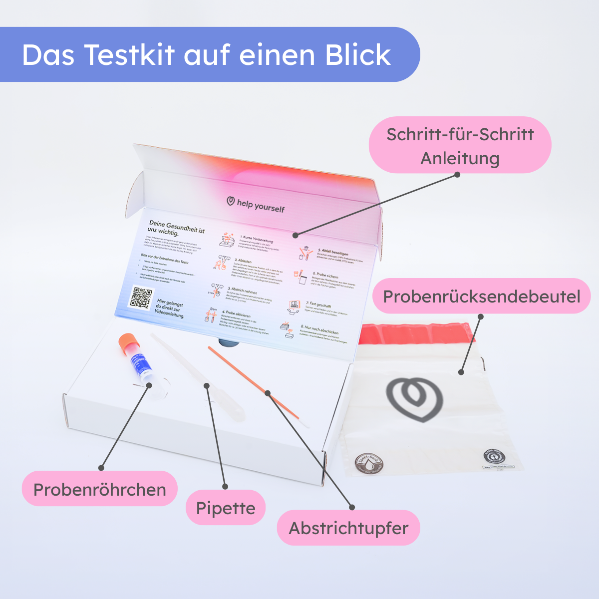 Du bestellst dir dein hy STD-Testkit direkt hier im Onlineshop und bekommst nach wenigen Tagen dein Paket kostenlos nach Hause geschickt. In dem Paket findest du alles, inklusive Rücksendeverpackung für deinen Abstrich sowie eine detaillierte Schritt-für-Schritt Anleitung zur Durchführung deines Tests.